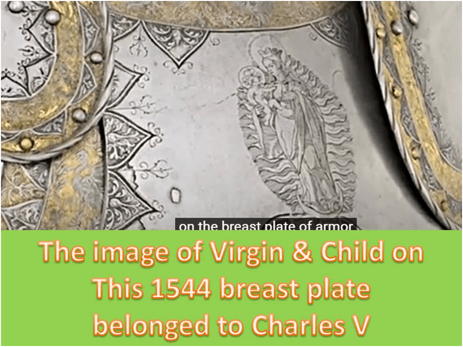 I think we can, for instance, see it in the armour and insignia he wears and in one sense is in a relationship of becoming in the type- figure of Miles Christianus, the Christian Knight of Erasmus’ famous work of devotion’.[8] This is reflected in the representation of Charles in armour as a militant holy warrior. We would, of course, be wrong to see the donning of armour for a portrait as a neutral choice until that armour is adorned with decorative symbolic art. It is already a symbol as Trevor-Roper’s reference to Erasmus shows. Such armour is only the more obviously indicative of the Miles Christianus when it bears symbolic references as in the 1544 suit of armour prepared for Charles V and bearing the inscribed image of Virgin and Child and in the Armoury Museum in Madrid.