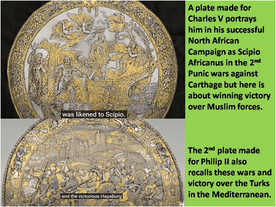 Such imagery remained current for Philip II, Charles son, as King of Spain as a comparison of the two plates shown below from the same source. Both plates below depict the Second Punic Wars between Scipio Africanus (portrayed almost as an armed medieval knight) against the Carthaginian Hannibal. It was easy to see here an analogy between the Christian forces of Europe and / or Spain and a Moorish, Ottoman Turkish or any other ‘alien’ (othered) enemy.