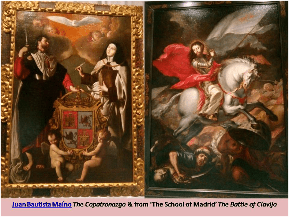 It portrays highly idealised figures of Teresa of Avila and Santiago Matamoros (Saint James the Moor-Slayer, one of the types of Saint James specific to Spain) and is adorned with the scallop shell associated to his supposed burial site in holy Compostella. Their canonisation as joint patron-saints of an ideologically united Spain had been successfully fought for by both Philip III and Philip IV only for that form canonisation to be early snatched away by Pope Urban VIII in 1629, who commanded that all the images of the two saints together be destroyed’ (though of course this one has survived).[12] This and another painting nearly adjacent to it in The Gallery explain why Saint James is associated with the militant warrior, in very physical martial terms. This further explains why there will be a stress in Royal portraiture on a king armed against intrusion, even when the territorial conquest of Spain was complete (and the scapegoat unconverted Jews and Muslims had been expelled) and the armour had become iconographic of that militancy rather than its reality. The other painting is The Battle of Clavijo (the possibly mythical story of that battle referred to can be found at this link) and creates a knight in equine pose (often employed for the Hapsburgs too) wielding his sword against Ottoman Turks, Moors and other infidels who appear as if in a picture of the Christ crushing the head of Satan under the feet of Man.[13]