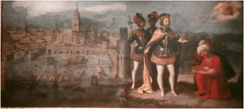 Hapsburg royalty might well choose to be represented in the holy defence by arms of the spiritual might of Spain both through the visionary and the armed military Holy Spirit, an ideal combination of Christianity armed in defence against unbelievers. Charles V was for instance still fighting Muslim rule across and ‘for’ Occidental Europe as Holy Roman Emperor. Sometimes this is done without the subtlety of Titian or Rubens. In Spain the example of the thirteenth century Ferdinand III of Castile is also of interest here. A painting attributed to Pacheco (and it fits his penchant for adding other figures and architecture to make a portrait pass as a history painting and vice-versa) depicts the Moors in the thirteenth century surrendering Seville to the newly united Castile and Leon. The painting shows the King in armour receiving visionary Vindication from the Virgin Mary in the heavens, whilst a fleet is being building in the mouth of the Guadalquivir, and recalling to me the theme in Ariosto which combine Imperial naval exploration and conquest in the New World with internal union of a Christian Nationhood.