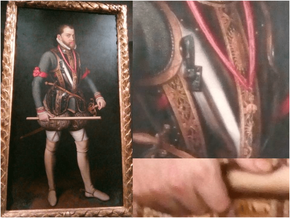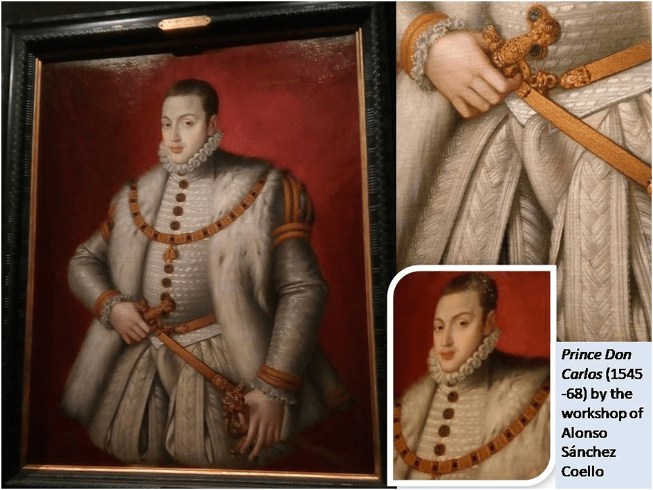 Of course Don Carlos in Alonso Sánchez Coello’s painting is not represented in armour (as he is in the Portrait of Don Carlos by Jooris van der Straeten) but in the grandeur of the supreme courtier as imagined by Castiglione, but as royal leader in waiting his attitude is also one of intended preparedness for military service. His pudgy hands grasp a dagger and sword handle respectively. The play of the rigid cloth of his courtly clothing frames a codpiece that stands between sword and dagger in the line between his hands marked by his gilded leather belt. Of course he still wears the Order of the Gold Fleece insignia but his costume is meant to enlarge and impress his person upon viewers in width, volume and costly and elegant quality. The contrast between this prince’s ‘two bodies’ could not, after all, have been greater. A young man destined for an early death, don Carlos was known not only as weak physically but as a boy whose abuses of his social power seemed to make up for very little feeling of genuine self-worth. Whilst a court-painter creates a symbolic body, that body too shares interpretative ideas of its value that can hide weakness but also display in apparent contradiction – a feeling I get in the contrast of soft boyish hands and military stance.
