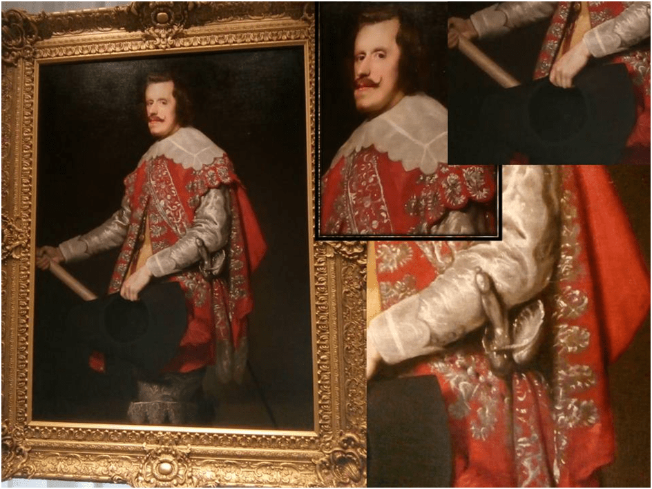It is very difficult to even try and improve on Jonathan Brown’s description of the painting, which I offer below. From that description I extrapolate two things. First that, Velázquez initiated a move that perfected an understanding of the portrait of a psychological turn to portraiture that no longer made the two bodies of a person and their status, as we saw even with Coello’s Mariana of Austria, in some way as integrated – even if with contradictions – but makes the body and its personalised dynamics more central than the status and ideal conveyed by other aspects of appearance, setting and props. Secondly, the artist aims in the portrait to show his own skill and standing qua the making of innovative artistic process as much and perhaps more than the personality represented, although to some extent these aims are all of one piece since the artist’s skill begins to lie more in their perception of character and its submerged narratives of biography and career. Brown says that this portrait: