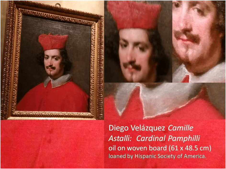 Brown’s critical magnificence is shown here by his brilliant understanding of the significance of the pentimento (reference to which I have italicised) which showed that it was most probably the painter who controlled the interpretation of the sitter rather than some negotiated detail, and that that painter knew what he was dealing with in this worldly subject, though with a kind of love for his utter humanity. For Astalli’s career was one of feckless careerism. He was nephew of Innocent X and appointed, according to Brown, to regulate papal business in 1650, losing his status only three and a half years later as a for his ‘incompetence’ in that role.[20] Yet that Velázquez found this man beautiful and witty I have no doubt. The face communicates even in its lighted gaze upon the viewer. To appreciate his beauty in the splendid scarlet of his robes with the impressionistic finesse of its lace edging at the collar is to see social ideas not merely embodied but in a way in which the body takes control of the appearance and reinterprets it in very humanistic manner.