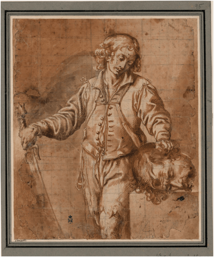 Moreover, the tradition Pedro Orrente imported back to Spain reflected a model of painting he learned with the Bassano family in Italy which involved the creation of genre scenes – reflecting ordinary life – its characters (and scenarios sometimes though not in the example I give below since the cutting of giant heads was not a common occurrence in seventeenth-century Spain – LOL) whilst anonymous young men in disrupted dress might have been. The trend in a more ‘modern’ Italian setting is clearly to the capture of character – akin to portraiture of course – of common men in common situations (however translated uncomfortably by the Biblical narratives they support). Here, following an Orrente drawing of David with the Head of Goliath is the Prado’s summary of this trend:
