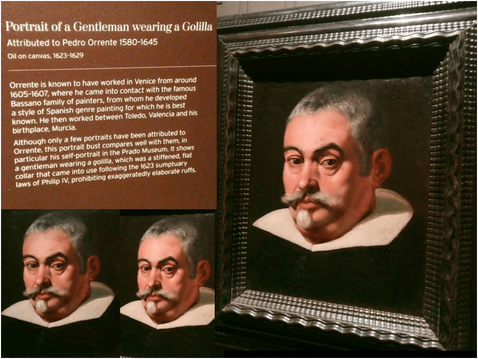 For me, subjectively of course, this is the feel of the Gentleman in a Golilla. For the Golilla is a reduced ruff imported into Spanish wear for gentleman, according to the museum caption (see below for picture [again] of this) in 1623 by the sumptuary laws of Philip IV.