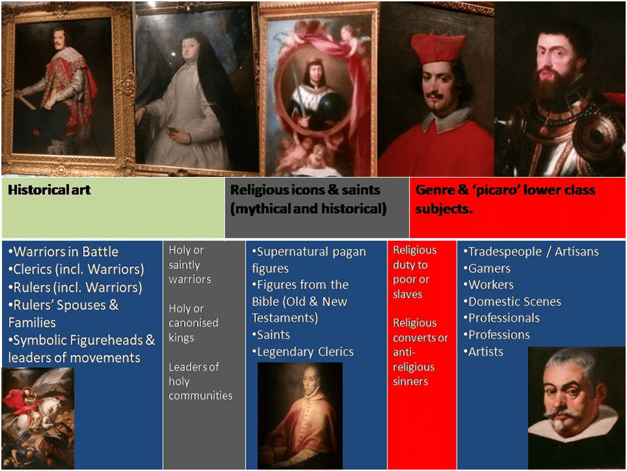 This blog has been long in gestation because the plasticity in defining and evaluating the portrait. The problems of defining the ‘portrait’ affects us from the offset even in considering a limited sample of possible examples such as those found in the Spanish Gallery. This is the case whether we seek a definition that is either, to use Shearer West’s analytic approach, either an a-priori to looking at examples of actual paintings and ontological (‘What is a portrait?) or an a-posteriori description of the functions that known portraits serve (West uses in this typology labels for functions such as ‘work of art’, ‘biography’, ‘proxy’, ‘commemoration’ or ‘political tool’).[2] However, the link between definitions of the ontology of this genre and prescribed judgements of its value have formed part of its history in all Western European countries, since artistic genres are so often understood as forming an a-priori hierarchy of value and significance, especially after the advent of national Academies of Art in the eighteenth century. Examples of such hierarchies pre-existed, though in different forms varying across time, cultures and place, the Academies of course.