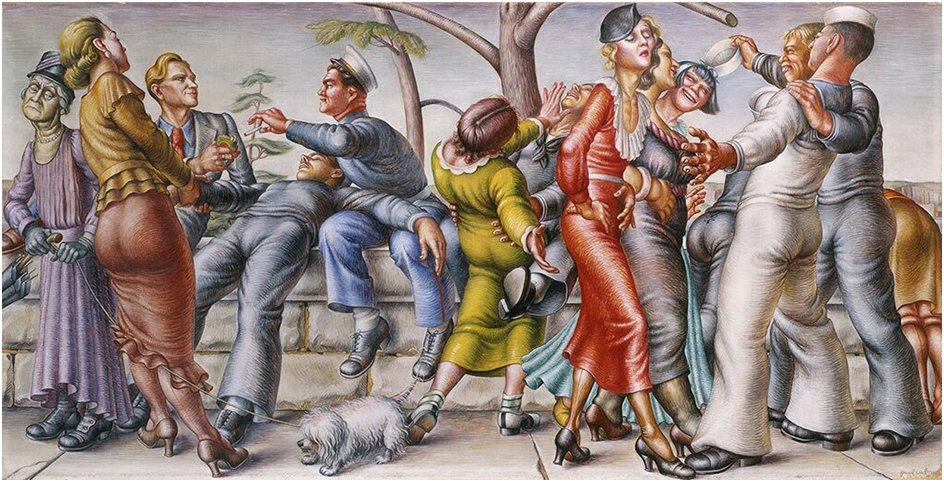 For Thomas Williams, George represents an easy and exciting sexual experience perhaps, even if only in imagination, in comparison to his wife, Lola, with ‘her hair tied up in a towel’, who even in his absence makes Thomas experience his body as in extreme tension: ‘straining his arms till they felt like piano wires drawn through the flesh’.[18] And this tension is precisely I believe because Thomas, as we are told in the story’s opening, keeps in his mind ‘the image of George’s arms at reach’: an image suggesting that man’s ‘strength and ease’ that ‘made [Thomas] forget the reticence he felt toward the white men with whom he worked’.[19] It reminds us that the love felt for an older boy in The Dog Star is to a young man called Whitey (and an emblem then of ‘whiteness’, whose body is stiffer and less yielding than George’s the imagination of another (white) man. Even more telling is the representation of the ‘negro’, with extremely wide buttocks, named Rosebud in the story of that same name. This man’s body is reproduced in terms of images of visceral heat in the experience of rushing internal blood that makes his eyes ‘’bloodshot and red’.[20] Moreover one almost feels, on his Harley Davidson bike, that he is rendered in the image of a phallus, growing firm and as a threat to power as understood conventionally; ‘… more powerful than any of the rich people he served, his waist growing up from the seat of his motor-cycle as firm as the trunk of a tree from the ground’.[21] Rosebud dies starved in the cold of heterosexual encounters gone wrong, his blood feeling like pulses of hot water falling into cold water. These instances are the sources I believe of Forster’s critical commentary about ‘warmth’ in his introduction to the stories. And all of them are about taking social and sexual risks in situations in which conventional morality is barely paid lip service. These are the queer choices of people seeking an alternative life I believe Windham to be consciously exploring, almost as if the burgeoning awareness of a queer community – a community parodied in stories of bisexual sailors (we have to remember these stories are dedicated to Paul Cadmus of The Fleet’s In) in the story ‘The Third Bridge’ and a story which follows it referencing silently the newly forming Fire Island community.[22]
