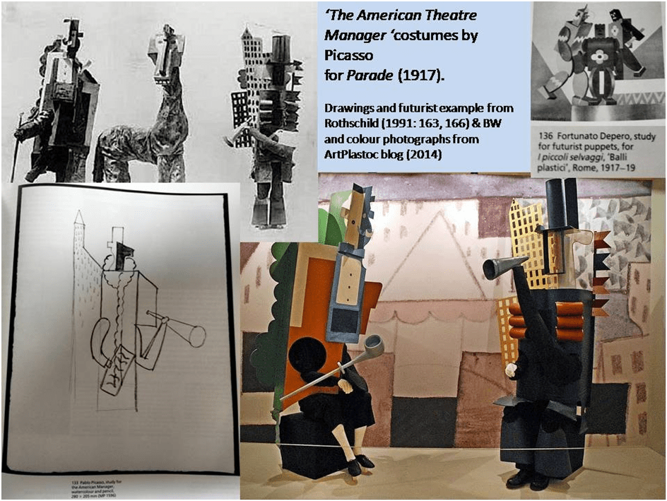 [5] Deborah Menaker Rothschild (1991:163 & 166 –latter for Futurist model) Picasso’s “Parade”: From street to stage London, Sotheby’s Publications with The Drawing Center, New York. And ArtPlastoc blog (2014) ‘249-PICASSO AND THE BALLET “PARADE”, 1917’ Available at: https://artplastoc.blogspot.com/2014/09/246-picasso-et-le-ballet-parade-1917.html