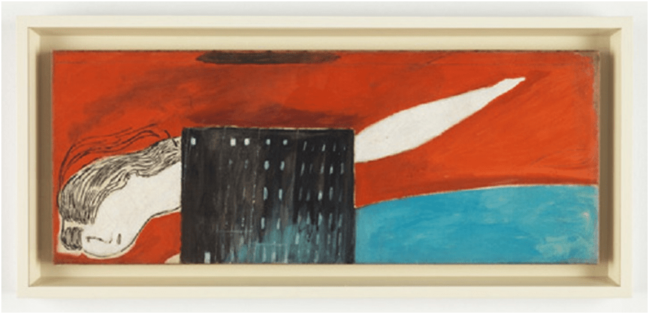 Of course the items are cup and ball play toys and to Fer this is an example of her ‘simplest figuration’.[9] However my error, given the absence of title makes me see this as if intentionally more complexly even if this point is not, conclusively, at least, proven. It again raises the issue of a girl’s perception of the world, including effects of the motivated distortion of perception, for the handle shapes of the toy variously represent the type of a code for a ‘normative’ adult female body, especially in the grey double of the toy in B. That ‘shadow’ (if that is what it is) is behind the representation of the toy which stands on the ground painted in black. It is as if the shade of the toy is painted on the red (wall?) surface. Here viewing the layering of the original painting might matter. However, beyond such distortions are others concerned only with the logic, or its absence, of the design of representation. For instance if the black stripe represents the ground on which the toy stands as I assumed above, why is the cord in A, lying not on that stripe but suspended above it, yet as if lying flat. Indeed looking at these pieces together, the issue seems to be one about whether it is ever possible to conceive of a simple figuration as implied by Fer.