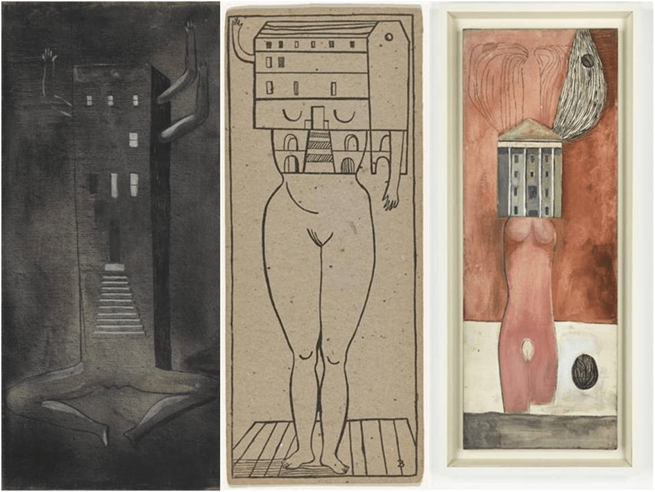 Wye also comments on the importance of this image in feminists taking Bourgeois to heart in America and this is right and proper and persists because the psychosocial themes are precise and pertinent to the genesis of female powerlessness in patriarchal society. However, I think the works also suggest that Bourgeois’ interest was heavily nuanced and aimed particularly at how girls become socialised into the pairing of safety with entrapment in patriarchy. Looking at Bourgeois’ other pictures that interrogate the theme of the house is then my next stop in this blog, beginning with (since selection is absolutely necessary) a haunting painting of 1941 that, like so many others is named as Untitled.