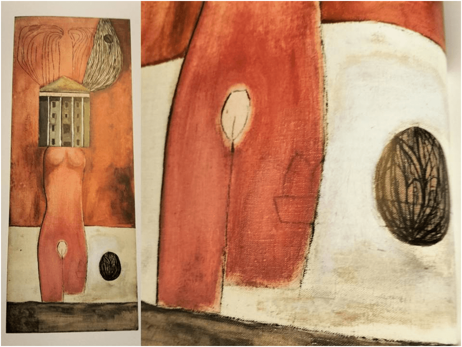 It is difficult for me to say how wonderful I feel is the second of these examples which ‘mines’ (quite literally) depth out of surface grids and layers (patterns of horizontal and vertical lines) making it meaningful, emotional and beautiful. These frames entrap whilst creating openness. We see this in the first example by her use of an intriguing and an obvious palimpsest wherein a ghostly figure is super-imposed above the inner guillotine like frame but perhaps also trapped behind the first and larger frame. I find it more than compelling. We are back from here to the Femme Maison paintings, which are so much more than feminist statements, though they are that as well in a very significant way, especially in an age like ours when the gender-critical can pretend to a very unnuanced ‘radical feminism’, as if the purpose of the movement was to rob women of the right to critical intelligence in the name of an identity label. Entrapments and openness in architecture are central In the Femme Maison paintings in their exploration of femininity and Fer links to major icons in the paintings, which should be rad after looking at these examples from the present exhibition: