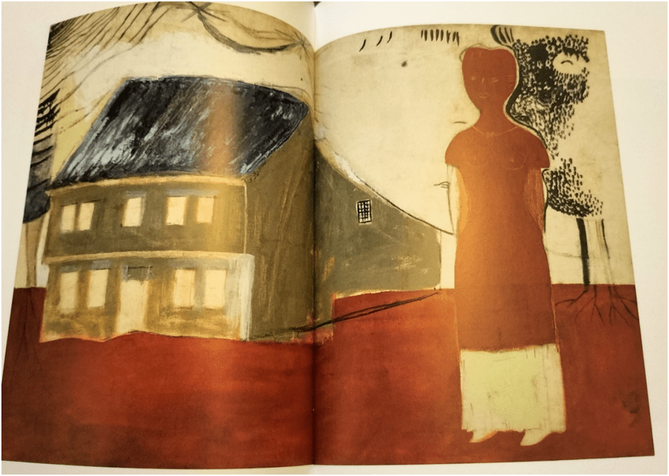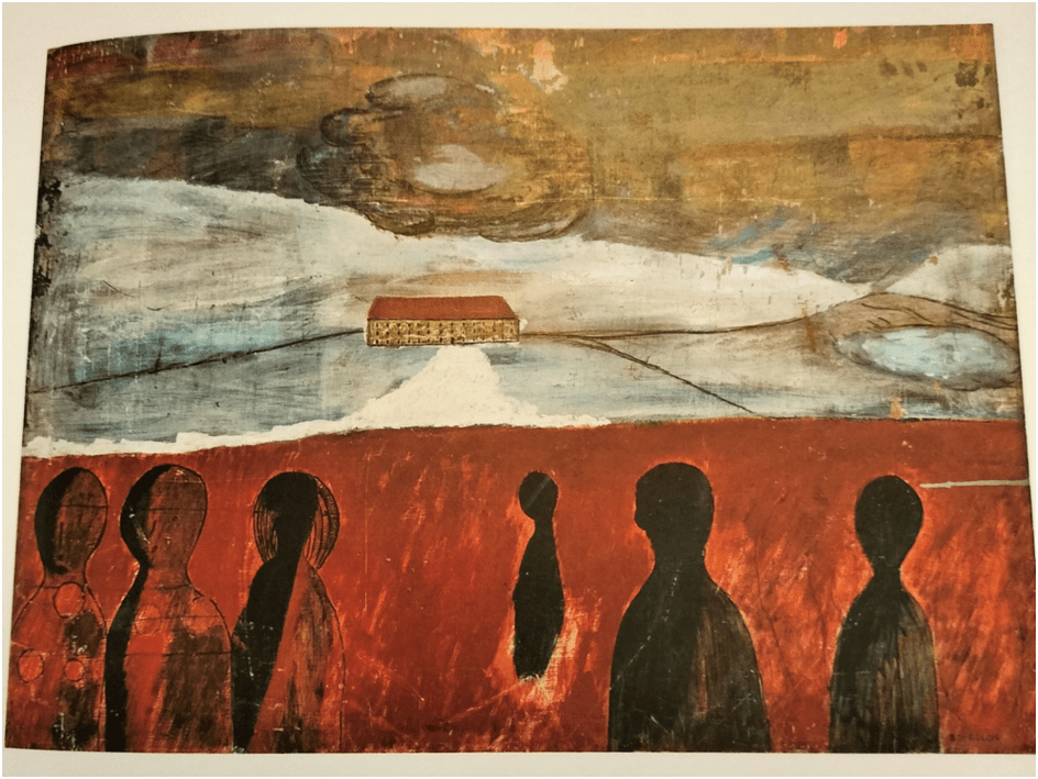 I call this painting haunting because of its deliberate distortions of objects and background. This even seems to suggest presences that are not transformed into forms in the painting such as the outline of figures on the viewer’s top right that obscures some of the tree that has been described by dabs of black. In the ‘tree’ itself, which seems to fragment into formlessness at its top there is suggestion of a face in a filled black form with emergent eyes and mouth. The figure’s face is naively drawn, as if in a child’s drawing and I think the painting as a whole recalls that idea. The house seems radiant through its windows and door space with a light greater than the background. Its rich colours contrast with a landscape that is variegated red like blood spilled on its ground, tonally contrasting with the figures upper clothing and face. My own feeling is that here a girl senses her future regulation by menstruation and its suggestions of adult sexuality. The house by the way as well as having open portals also has a barred window at its rear – clear hatching effects not seen elsewhere.