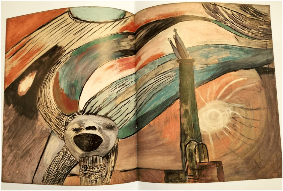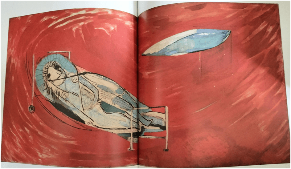 Instead she moved forward with less obvious plays with the surface – depth paradigm that had first produced the fashion for grids, because it accepted the flatness of the painting canvas. She moved I think into using washes of layered colour and passion playing around figures painted with a kind of abstraction such as he had shown in Red Night. The best of these being that featured on the cover of this book (Untitled 1946-7 p. 108f.) where figures and background are difficult to separate and in that sense abstract but integral to complex nuances of emotion, thought and sensation, which I am not going even to try to unpick.