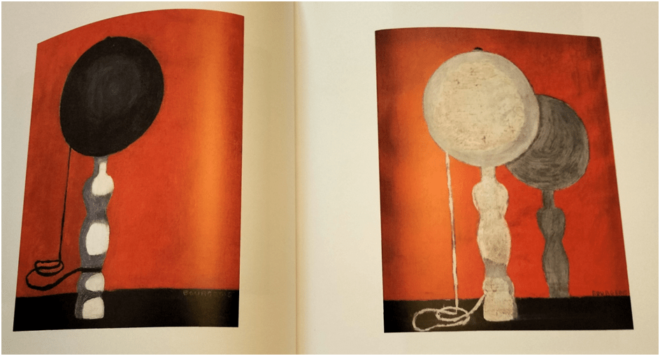 Feelings and thoughts about home interiors are often channelled in Bourgeois’ works through objects of use or play: the most intriguing being the two paired Bilboquet paintings of 1946. I refer to them as (from viewer’s left to right) A & B respectively.
