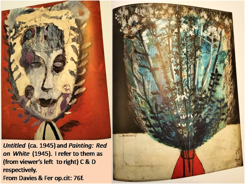 Other paintings radicalise imagery usually associated with women such as floral bouquets. The association is built in social practice wherein women become responsible for the beauty and decoration of the home, as well as more pagan associations with the flower whose beauty leeds to propagation of a species. This leads me to my favourite paintings paired in the book for this exhibition, from around 1945: Untitled and the more well-known Painting: Red on White. I reproduce them below and refer to them as (from viewer’s left to right) C & D respectively.