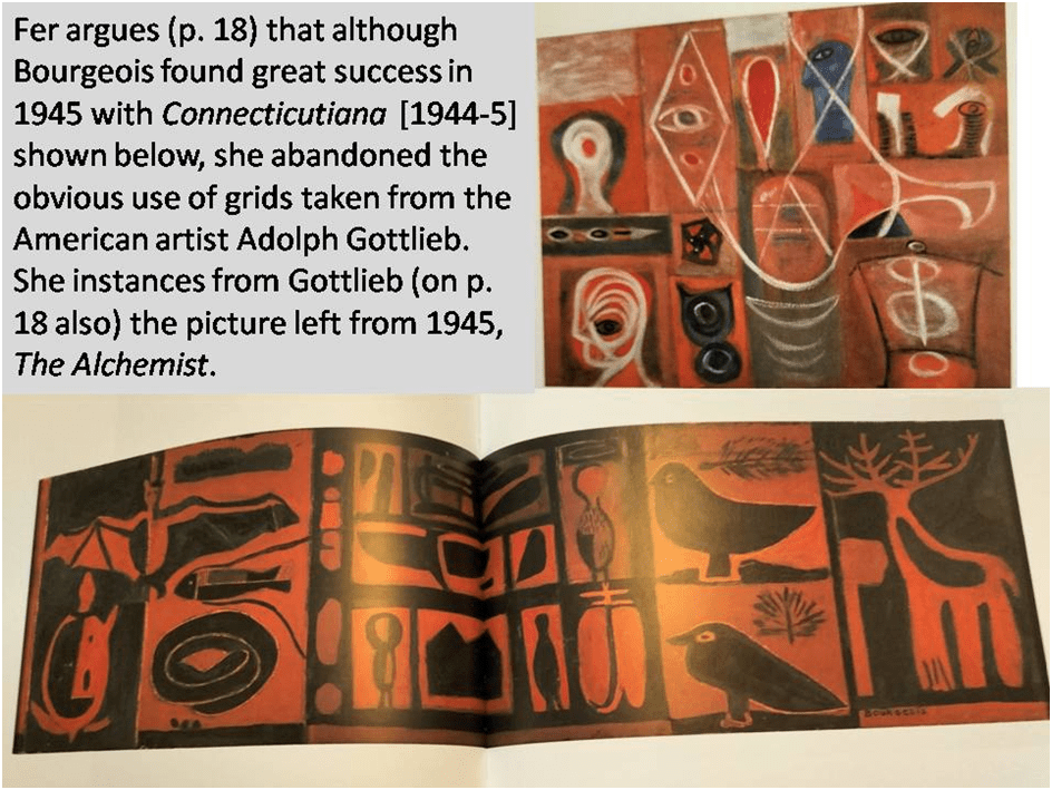 Some of this effect is explained by Fer in ways (which seem totally right to me) of seeing Bourgeois as attempting to knit together a theory of representation that worked for a French female émigré when the traditions that were emerging were either brash male theories from Europe in the form of a doctrinaire Surrealism and the male search for newer forms of iconology, even if they looked back to much earlier traditions, in Abstract Expressionism, such as Pollock’s interest in Native American imagery. In Abstract Expressionism that search was associated with frameworks drawn upon the painting’s surface. Fer brilliantly shows that Bourgeois rejected more schematic forms of the grid such as those displayed by Baziotes and Gottlieb but her paintings show that she still looked to the freedoms of experiment they offered to her. Compare for instance: