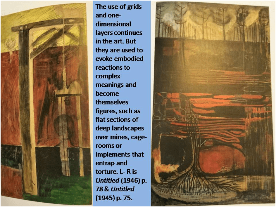 Such pictures did not mean the end of her use of grids and one dimensional layers however. Rather they are put to use to evoke a very embodied reaction to complex meanings and become themselves figures, such as flat sections of deep landscapes over mines, courtyarded houses or tenements, flats and large mansions or implements that entrap and torture. We are looking out to the later sculpture but we do not need that to fully appreciate some wonderful paintings such as those exampled below.