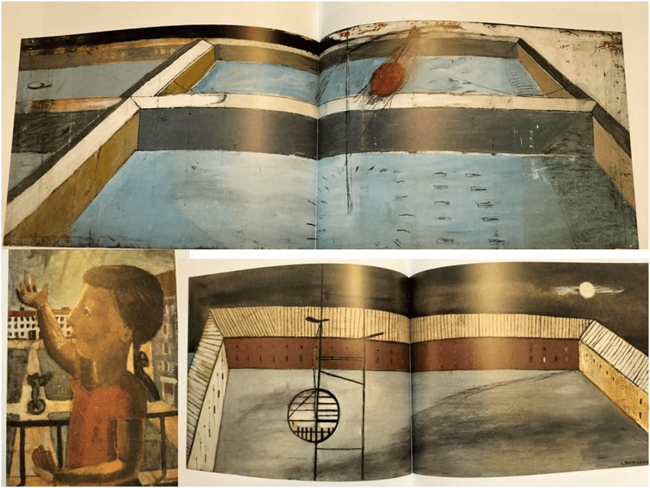 Even in 1939 Bourgeois envisages herself as a young girl feeling the rain outside from a balcony with a protective but imprisoning railway, in a grid courtyard that entraps artforms – such as (I take it) female angels – but also exposes them. The latter are described by Fer as ‘eerie, empty spaces – one solid, one watery – surrounded by blank facades that could represent a museum but are more like a prison or barracks, showing the perverse and brutal grip of imaginary classical architecture’.[14]