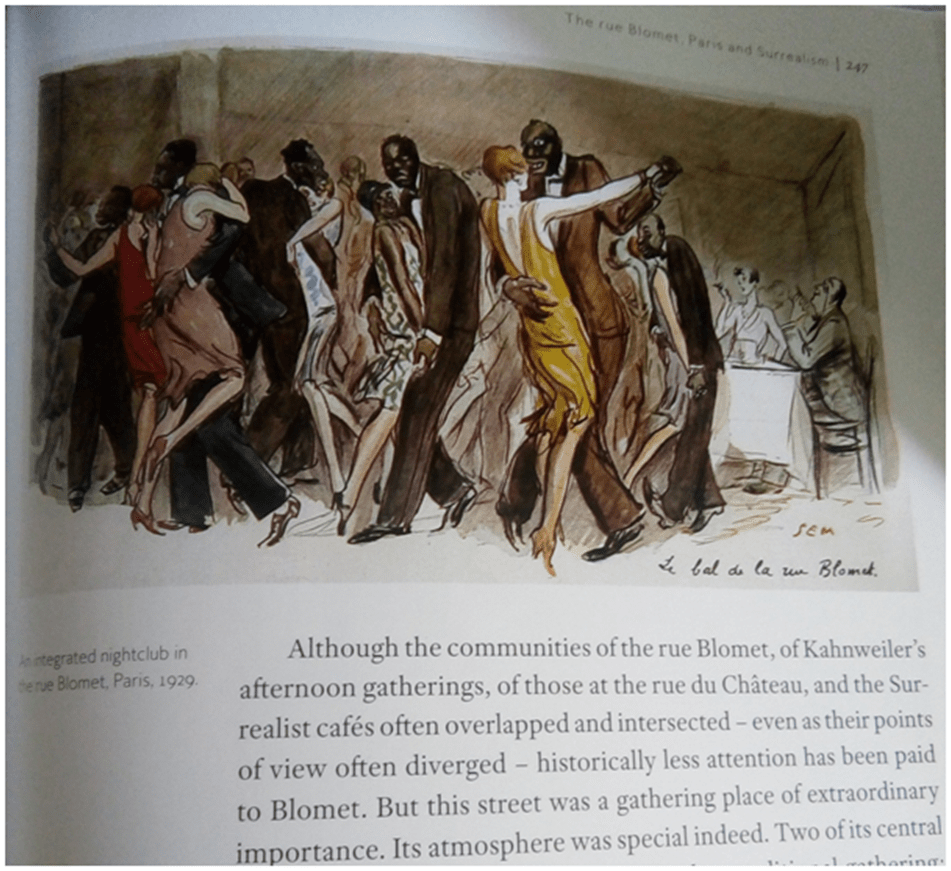 … illustration in colour meant to represent a caption reading: ‘An integrated nightclub in the rue Blomet, Paris, 1929’.[5] I show that page below but also apologise to anyone from the black community who may chance to see it, for this not only ‘others’ black people but renders them as grotesques and sexual predators – a stereotype so close that of ‘bourgeois mores’. Yet there is no comment on this from Caws, who must have approved its inclusion.[3]