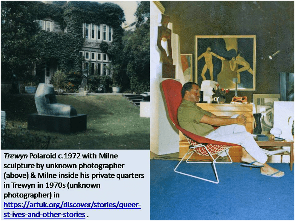 Eddies’ story, as reported by Levine at least, supports Massey’s point made several times that fears (of the size of a moral panic) of queerness as a social contagion existed alongside a belief in the queer artistic community that there were no issues of prejudice in St. Ives. It may have been part of a helpful myth to believe that John Milne just ‘fitted in’ and that: “People’s sexuality was 100 per cent accepted by everybody, even the fishermen”.[14] However, Massey elsewhere quotes a judge in a case in The Times in January 1954 promoting a common view of the period that ‘once vice got established in any community it spread like a pestilence and unless held in check threatened to spread indefinitely’.[15] As Massey says therefore it is questionable ‘how deeply this liberality ran’. For instance a heterosexual man, Reg Singh, who stayed at Milne’s Trewyn was ostracised for a few days by his girl friend and her family ‘because it was so infamous, the place, she just thought I was gay’.[16] And even Milne called an ‘Australian Queen’, who was visiting St. Ives, ‘idiotic’ and a fool because, after a ‘severe assault’ from two youths, he ‘admitted in court last week, that he is homosexual! Fool- the one thing one should always deny’.[17] That Milne spoke of another queer man, one not aware of the extremities of English anti-queer law, with so little empathy for mistakes, calling the assault merely a ‘beating up’ though the man’s skull was fractured and his head lacerated, suggests that internal support in queer and other St. Ives had its limits and conditions, even if, in the legal circumstances, these were understandable. It is still not acceptable to ‘blame the victim’ for their own oppression.