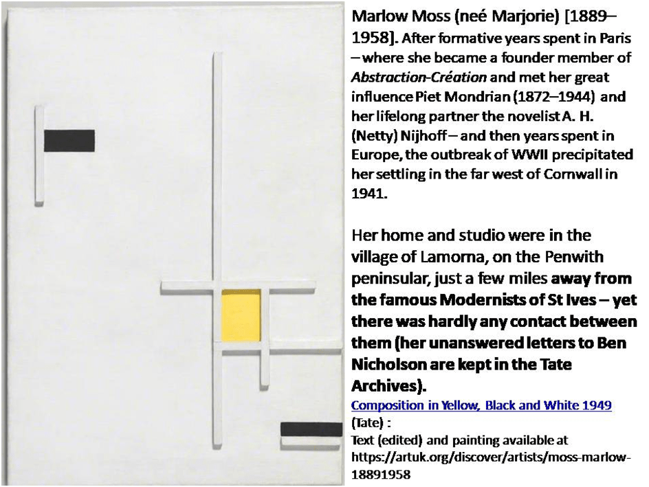 Yet this work too plays with notions of confined space and absence, such as must have been Moss’s experience. Massey interprets this as possible evidence for professional jealousy, stating that they saw her as an ‘interloper, a threat to the primacy both in St. Ives and beyond, for her links to the avant-garde were every bit as strong as their own’, since her professional friendship with Mondrian pre-dated theirs. After Moss’ death, Hepworth spoke of Ben Nicholson’s, in particular, and her own right to be ‘paid tribute’ for their ‘contribution to the international links in England via Paris’. [11]