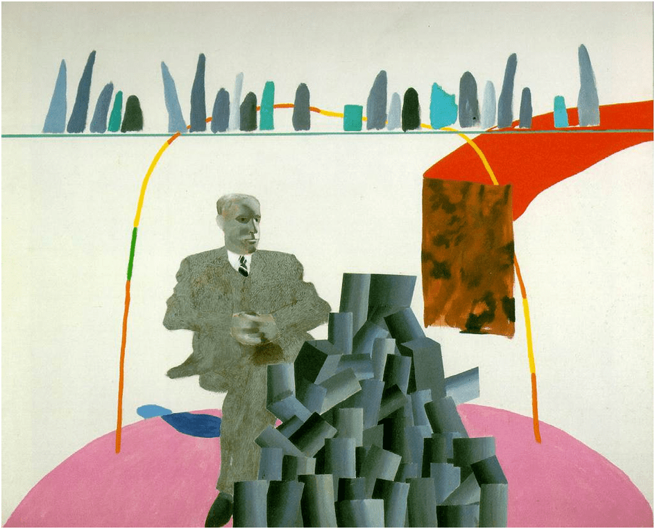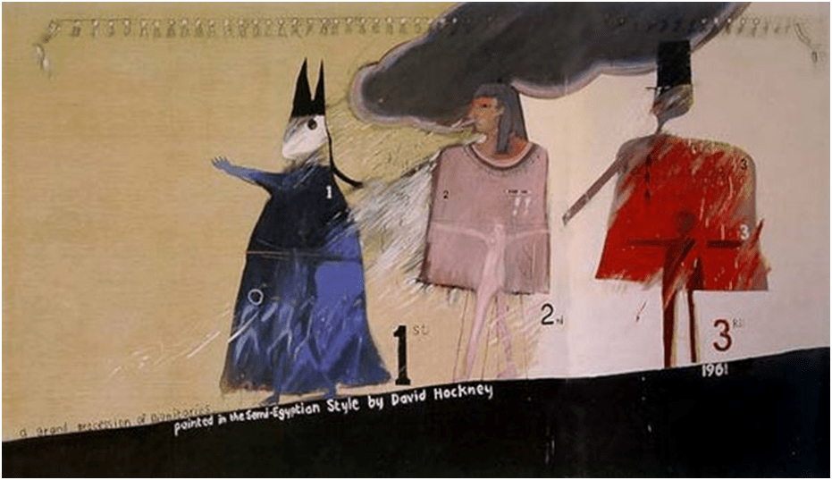 In this remarkable analysis, Gayford points to the manner in which it references visual devices and tropes utilised by other painters, like Cezanne and Bacon to solve common problems of perception but not to emphasise effects of power. And perhaps he is correct that in 1966 Hockney’s ideas were less formed about the problems of the photograph as a key formative influence in describing reality. However, Hockney’s ideas about the power of the image in public and private political systems were well worked out, as I would argue his 1961 A Grand Procession of the Dignitaries in a Semi-Egyptian Style shows. Gayford however here discusses this painting only in terms of stylistic characteristics.