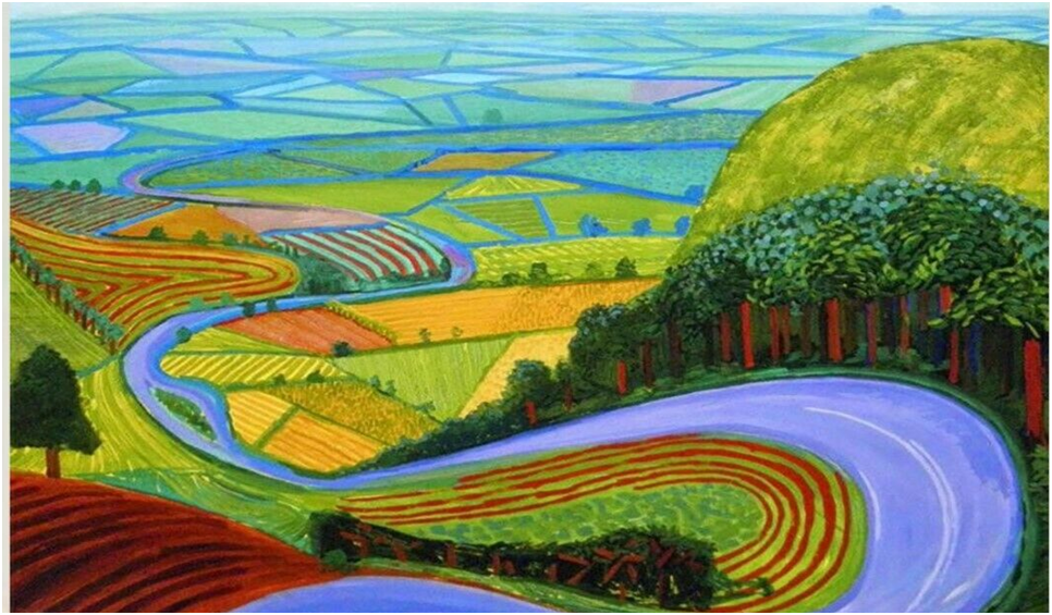 The relationship between sensory events and physical events becomes a matter of ‘feeling’ the forms, spaces and colours under the scrutiny of our mobile eyes and subject to our mobility as a spectator. … [Hockney] exploits vertiginous instabilities in his images of the Grand Canyon and Garrowby Hill.[16]