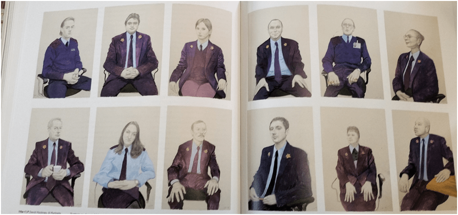 Hockney responded to Ingres’ portraits in an exhibition at the National Gallery in September 2000 with twelve portraits of uniformed gallery staff. For for these low-paid workers uniforms represent a symbol of their wage-slavery to the art institutions that did not otherwise cater for people of their class and status. Munro says the emphasis on uniforms however was only by and large a ‘witty and insightful homage to Ingres’.[20] But surely it is more. On the one hand, Ingres valorised the individuality with which he was able to pay homage to wealthy sitters who earned him his considerable income by the use of uniformity gained (Hockney thinks) from optical devices. Hockney, on the other hand, valorise, (as Munro illustrates well) the diversity of the gallery staff despite the attempt of the uniform (the same clothing that institutionalised them) and the ‘uniform’ poses Hockney actually imposed on them. Whilst Ingres’ sitters may rejoice vainly in the uniformity of their images with a received idea of their social worth, Hockney’s sitters establish their own unique characteristics as a function of their reduction otherwise to ‘uniformity’ (unisex regulation blazers … and institutional insignia’). Art suddenly is not guarded by them for the sake of entitled classes but is owned by them and their contributions to the portrait-making; ‘one holds a cup of tea, another twirls a pencil’.