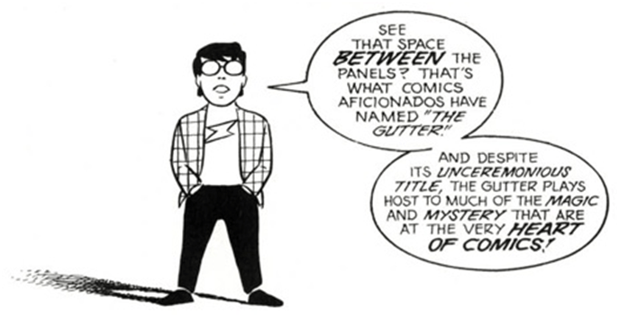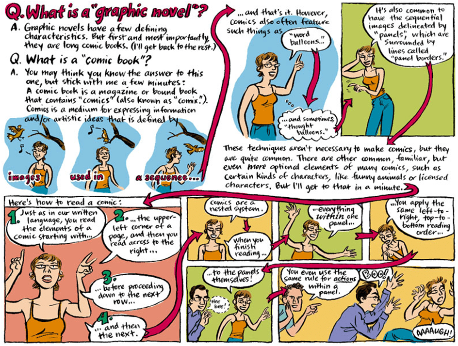 And, one better still is this graphic consisting of panels of various kinds, balloons for text that is supposed to voiced (or thought) of various kinds with gutters. It illustrates the conventional Western reading sequence of these novels / comics also.