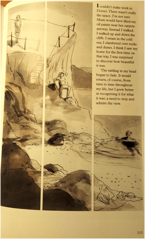 The beauty of the scene though begins to be demonstrated much more fully on page 27, where the beach and hills are seen in colour. Of course there is a red-coated lonely figure on it, which may be Alison, bidding farewell to a scene in which she has only just begun to notice its beauty in a rich and lively way. The reader, however, is inclined to linger on that page absorbing it and contrasting it with the text opposite, framed in the richest deepest black telling of the duration of the marriage break-up but not referencing this scene. By the time we see the scene again (as in Figure 9) it is covered over in gloom, though blue skies (bright blue paint it seems layered over by black and grey paint) underlies the gloom. The recurrence of the picture indicates the scene to which Alison must and will return – mending her and her parents’ relationships to her and each other, being with her father too before his oncoming death. And when she goes back (and here’s Stewart’s brilliant narrative technique), exploring that coast over three frames on page 115 (figure 11) and swimming in (rather than being lost in as on pages 108-9) the water of the beach rather than feeling drowned by it as in page 108 (figure 9), she says (as cited in my title): ‘The rattling in my head began to fade. It would return, of course, … but I grew better at recognising it for what it was: a need to stop and admire the view’.[2]
