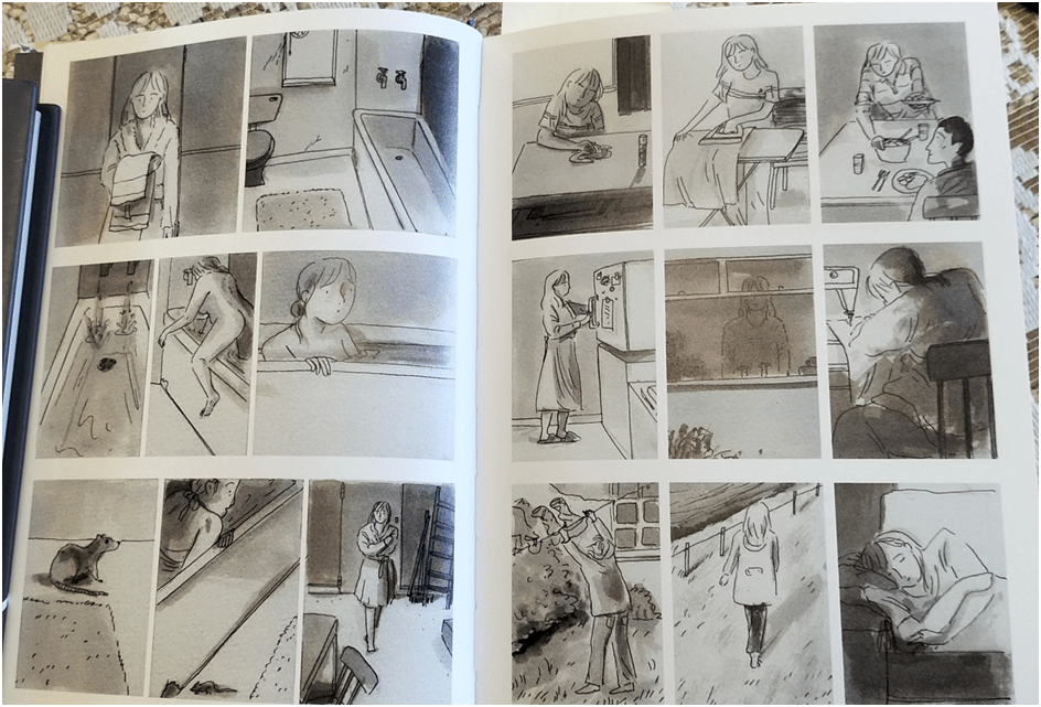 We may be hard to convince that an effect of perceived soundlessness is created here just because there are no speech, sound or thought bubbles. I think that is because we lose the somatic sensations of mouthing elicited by words, especially when visually portrayed mouths are its source. We might intuit thought in Alison but what we notice most is that there is no space given to either talk or thought in this opening (Pages 6-7), so that we feel the preternatural quiet of her day. It conveys a busy solitude to compare with the static solitude of the full page picture that follows it (p. 8) with a single line: ‘But I was bored and I was lonely’ seen on the outside left of the collage below (Figure 5). Once the pace is changed, Alison is left alone with only space around her being filled with the meaning revealed in text. The view of the hills and beach, so beautifully drawn and captured, is not beautiful for her but merely empty. I will however return to the analysis of this page later in the blog.