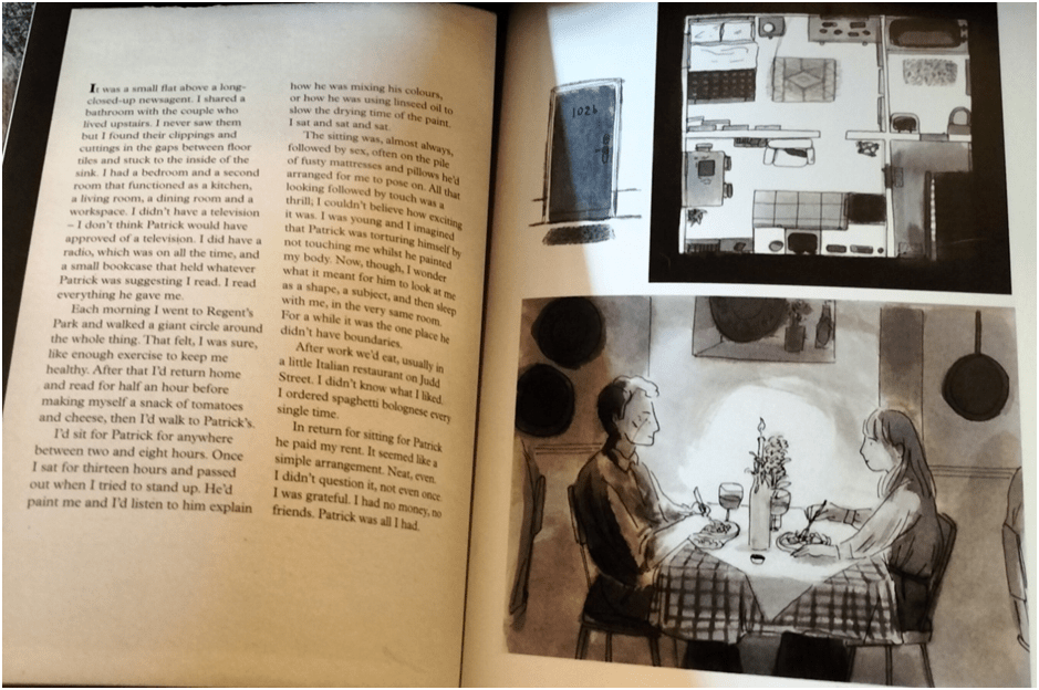 In Figure 6, the black frame in each case hints to the reader of the imprisoned constriction we know that Alison will eventually feel in this flat dominated by Patrick’s view of women, art and life as a commodity manufactured by him for his own self-image. Alison lives there, it seems, as his ‘mistress’ (or at least so it seems to us, though his ‘wife’ is not a woman but his very selfish conception of his role as the Artist). It seems too that Patrick’s oily narcissistic readings of his relationships feed off his belief that women can be persuaded to live in romantic dreams nourished by him from a substantial income in art that sells. The dream is belied by the ‘clippings and cuttings’ (from the body parts of upstairs neighbours) ‘in the ‘gaps between floor tiles’ in the flat’s shared bathroom. Of course, this is also a nuanced narration of the relationship and Patrick is more than the simple Lothario he seems. Stewart’s picture of their meals together in an Italian restaurant above show a shared glow between them (not just made by candles), in which both of them believe, at least at the moment and outside the grim door (pictured above of flat-cum-prison-cell 1026).