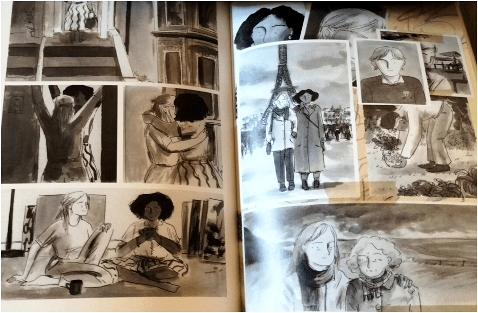 Although page 132 is a relatively straightforward graphic novel narration, if with significant pane size variations such as the drama of the meeting between Alison and her lover and artistic colleague (whatever the relationship they are. unlike that relationship with Patrick, equals) Tessa Effiong, a sculptor. Facing it is a series of frames aping photographs, together with signs of the Sellotape that sticks them onto a paper backing. The backing itself is a yellow sheet bearing coloured pastel shadings and doodles that shows it as once the drawing paper on which an illustrative artist practiced her colour combinations. The photographs clearly come from different parts of the story but show her father (in the garden), her mother (presumably after their new understanding has been established because they look comfortable with each other), Andrew, her beloved nephew and Tessa and Alison arm in arm in Paris. The latter overlays separate pictures of each woman, showing without telling the change of their relationship into mature love. Nothing could show that Alison’s life has become enriched and nuanced with almost everyone who matters in her life, though Patrick is now history and Patrick will soon die.
