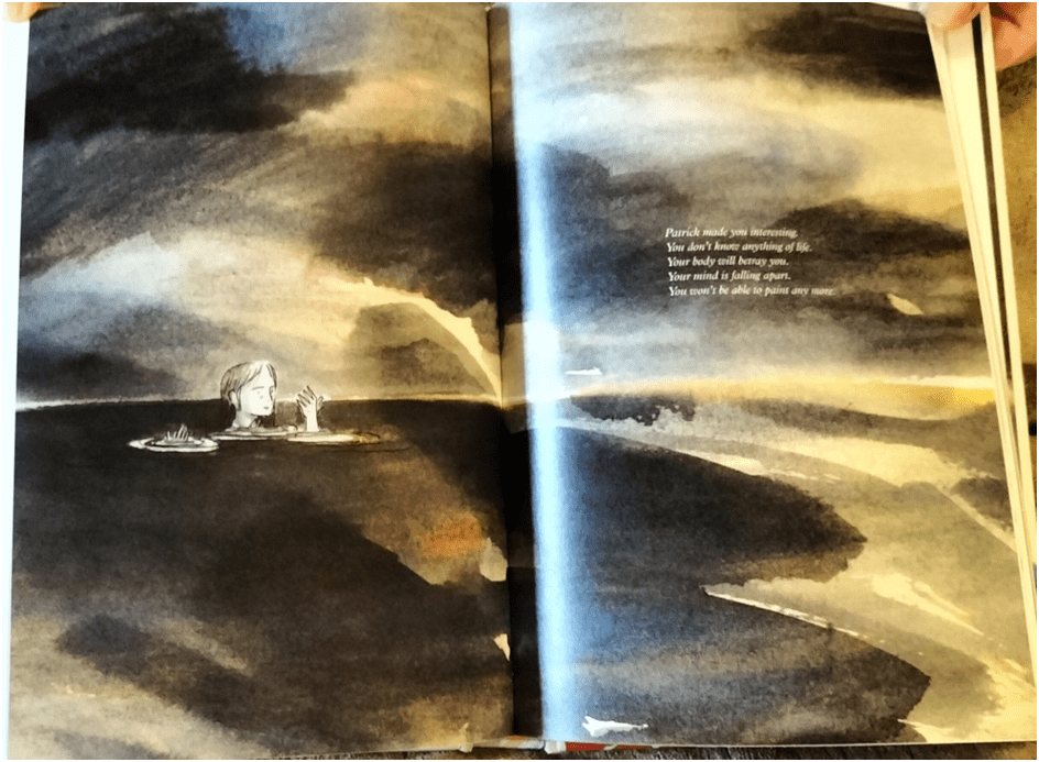 We can see it in Figure 9. But, before doing so, it’s worth considering whether this is simple mood painting, for the dark is flecked with underlying blue. Though made of colour inks as book illustrations must be it seems also to ape the layering and scraping off method of ‘painterly’ oils (the method say of Frank Auerbach though objects are not as abstracted).
