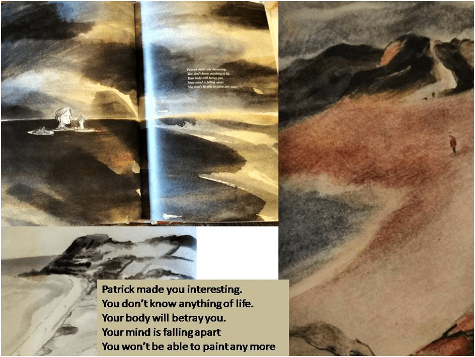 We should consider too how the narrative begins to employ colour, in some panels to demonstrate the new energy of Alison’s vision as a person and artist. The latter melds with the project as it must seem to Lizzy Stewart, as a vehicle for her finest art, and to the reader’s need to see, feel and sense life in pictures in a much richer way. Some of the fine ones are viewable in Figure 1 above. The acme of this trend is the beautiful showcase illustration of Alison, in her colourful and tasteful 60s, sitting in front of a white gallery wall showing a retrospective of her pictures (although somewhat eccentrically hung, if this is meant to show a true contemporary gallery). I cannot bring myself to reproduce this, because it alone is worth the cost of the book. It is meant to represent a show called ‘Work Space’ and it appears as a full opening of pages 166- 167, though the pages aren’t numbered per se.