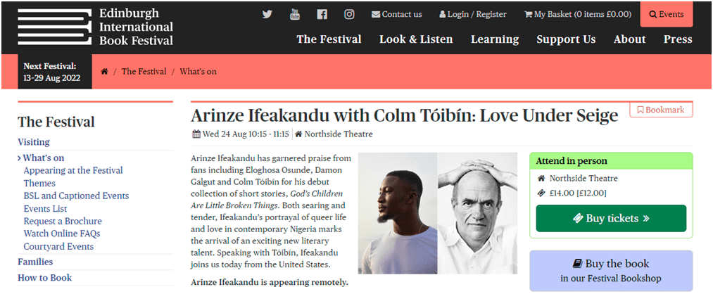 And there I want to leave this book but I will revisit it, for in part this blog is a preview of seeing Ifeakandu at Edinburgh Book Festival interviewed by Colm Tóibín. I am awaiting this with great expectations for these writers span generations in responsible queer writing and I can trust the elder writer to ask the right kind of questions of the younger, and invite such from his audience. I will refer back after the event. Meanwhile if you can’t get to Edinburgh (still tickets left) then read the book anyway. It is a treasure in any kind of writing – in queer literature it constitutes a turning point.