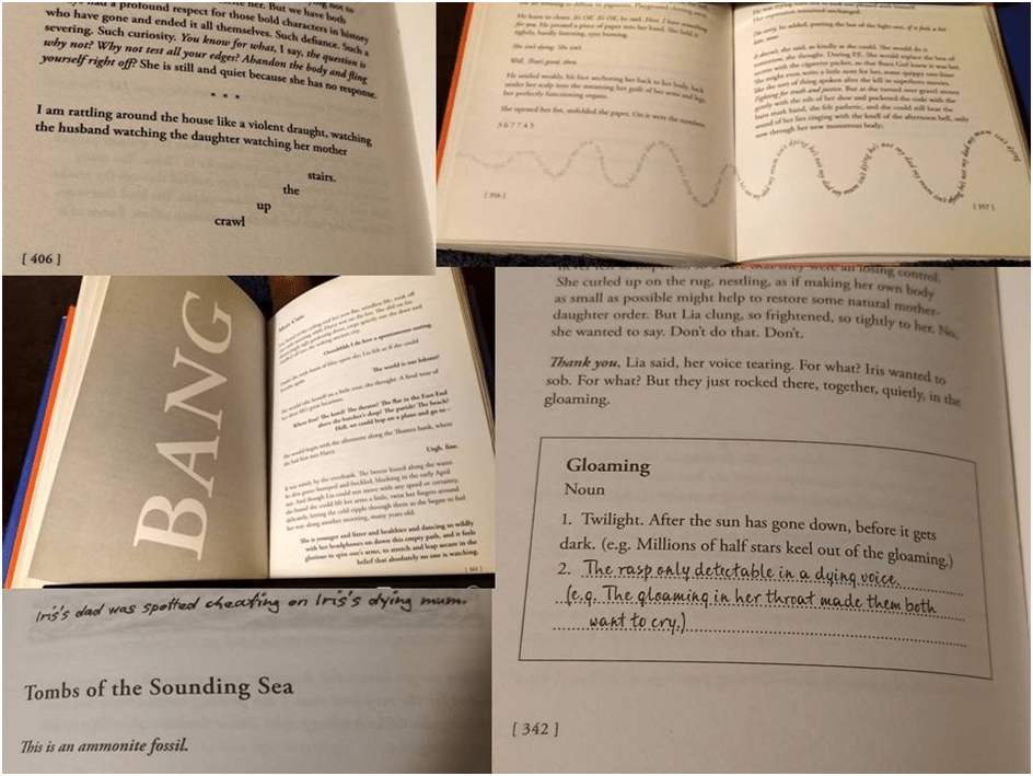 Mortimer’s writing is endlessly inventive. It includes different fonts, stanzas, visual arrangements, lists and playful definitions, without settling on a particular approach. Images are often pleasing and convoluted, as when Iris considers growing up as a process of moving across from the world of her mother to the world of school in a “terrible act of osmosis”.[6]