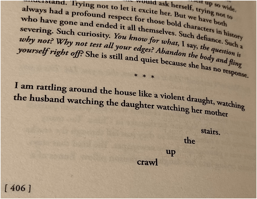 This is the voice of the alter-ego narrator, which speaks of Lia and other characters as if they were a part of themselves as a collective ‘We’. It speaks of the transgressive excitement of suicide. It does it with some play with its own look as text – in the reference to ‘respect for those bold characters’ (printed, as it is in bold typeface ‘characters’ (another name for the appearance of letters in a word). As Klaces says in the citation above, this is this narrator’s ‘signature bold type’. But the effect I want to notice is the play with printer’s conventions at the bottom of the page. It is the convention in Western writing and printing systems to read from left to right and from top to bottom on any page and between pages. This is the exact reverse of many Oriental languages.