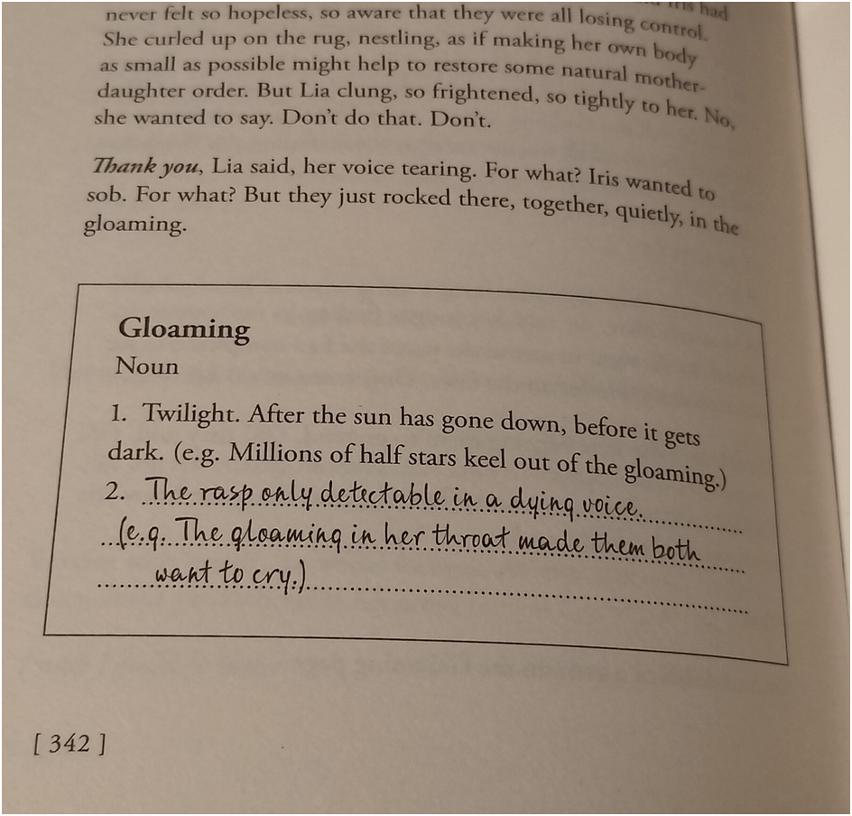 More important is the fact that these points about language grammars and lexis (especially the latter) are central to the story and its characters for Lia is a writer and illustrator whose obsessions with lexis are translated into an occupation as a writer and illustrator of innovative educational books. The book she is working on through this story, but will never herself complete, is quoted from sometimes. In doing so even its printed format (in which each word of interest is both ‘defined’ and printed in a box) is reproduced. The book is called The Children’s Guide to Lexical Spectacles. Iris will commit to complete the writing of this book, in lieu of her mother, on the latter’s death and in honour of her. Her ability to do so is based on the ‘many years of bedtime word-talks’ enjoyed by them in interactions essentially about learning creative connotative thinking.[9] We see these ‘definition boxes’ throughout the book as they are being revised by Lia or Iris (how would we know for the exact location in time of the state of this writing is not made transparent) with written definitions that start with the denotative. These ‘definitions’ are followed by less typical and connotative (and sometimes personal) interpretations of the word written in as if in pen (but in fact, of course, in an invented character script made to look like human writing). From the start we are told these definition grids would contain a typed ‘lexical entry’ but be followed by : a blank space/ / to fill in one’s own definition’.[10] As the story develops, we realise that some of these ‘pen’ additions might have come not from Lia but from her daughter, Iris.