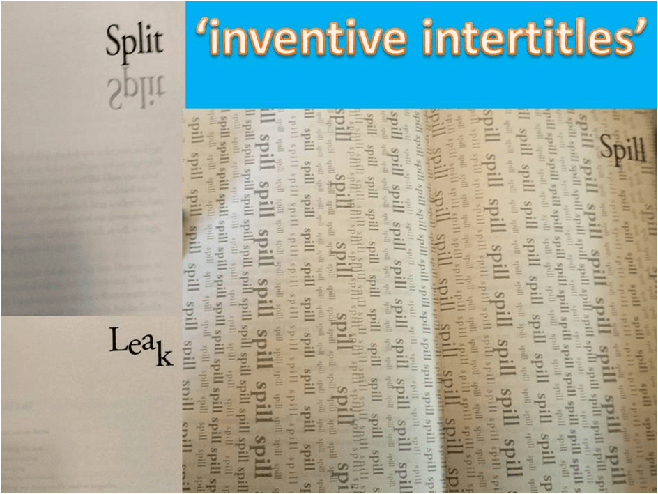 Leaking has many near-synonyms in the novel, although they often connote a very different pace and urgency of emission though a containing membrane or otherwise sealed restraining lip. Leak, Spill and Split are all used as ‘inventive intertitles’ (see above), often with illustrative calligraphic effects.