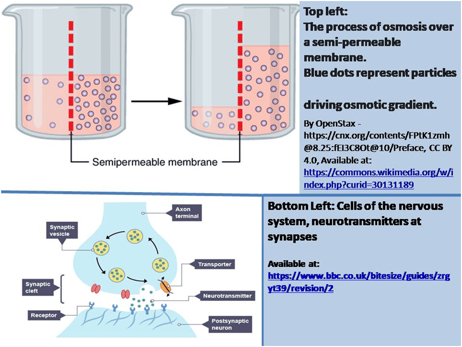 Variously these describe the transmission through a semi-porous membrane, like that of a cell (such as those at a synapse in a nerve cell) through which material may ‘escape’ a membrane container. They show how matter is ‘let out’, or in the case of cancer cells in the body ‘let in’ by these transactions. All of these near synonymous phrases are used in the novel, some of which I will show. Thus the voice of the cancer itself, which some argue is part of the identity of the alter-ego narrator, argues that with the visceral brain: ‘There is always a way in, / a latch left open’.[16] Elsewhere it rejoices in getting in, secreting it’s victory in a footnote through ‘a break / a shatter / a squeeze / a leak /’. ‘ … /And just like that,1’: the footnote to this superscript reads: (‘1 I’m in’).[17]