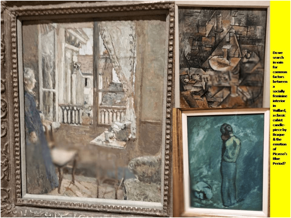 Many paintings in here are either often labelled impressionist or expressionist and some, like the Nabi school represented by Vuillard and Bonnard, fit into neither. The exhibition ends with Matisse whose example gives credence to neither category nor any other, including that of Fauvism, probably the silliest of art historical labels. One oil painting from Cézanne stands alone in significance to me (although I lean to a few such others from Van Gogh and Gauguin also). They all defy the meaningfulness of those critical labels too (the label of Post-Impressionist they often get tells us very little). At the end of the ‘period’ covered by the exhibition(and this too is vaguely defined) the contradictions between the visitor’s search for coherence in the collection and the random discovery of individual paintings with little in common with pictures near to each of them is even more pronounced. Do we search in vain for common factors between a socially feminine interior in Vuillard, a classic cubist candle-piece by Braque & the emotion of Picasso’s Blue Period? That is to say nothing of a final room of beautiful Matisse cut-outs, which feels appended to the exhibition- beautiful and interesting appendage though it be.