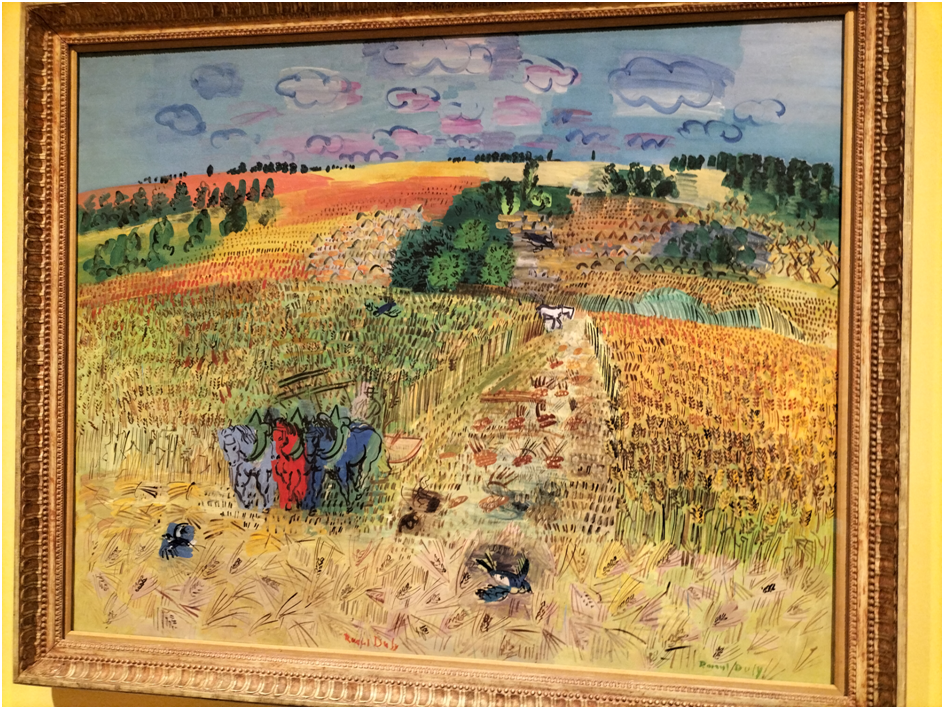 It is not possible to convey all the beauties and wonder of this exhibition. I think this comes precisely because the distinctions between works are so rich that they cast themselves into comparisons between works of art often seen as more like each other. I felt I saw things anew. Sometimes I discovered a new beauty that I could compare to no other picture here, such as Raoul Dufy’s The Wheatfield (1929).
