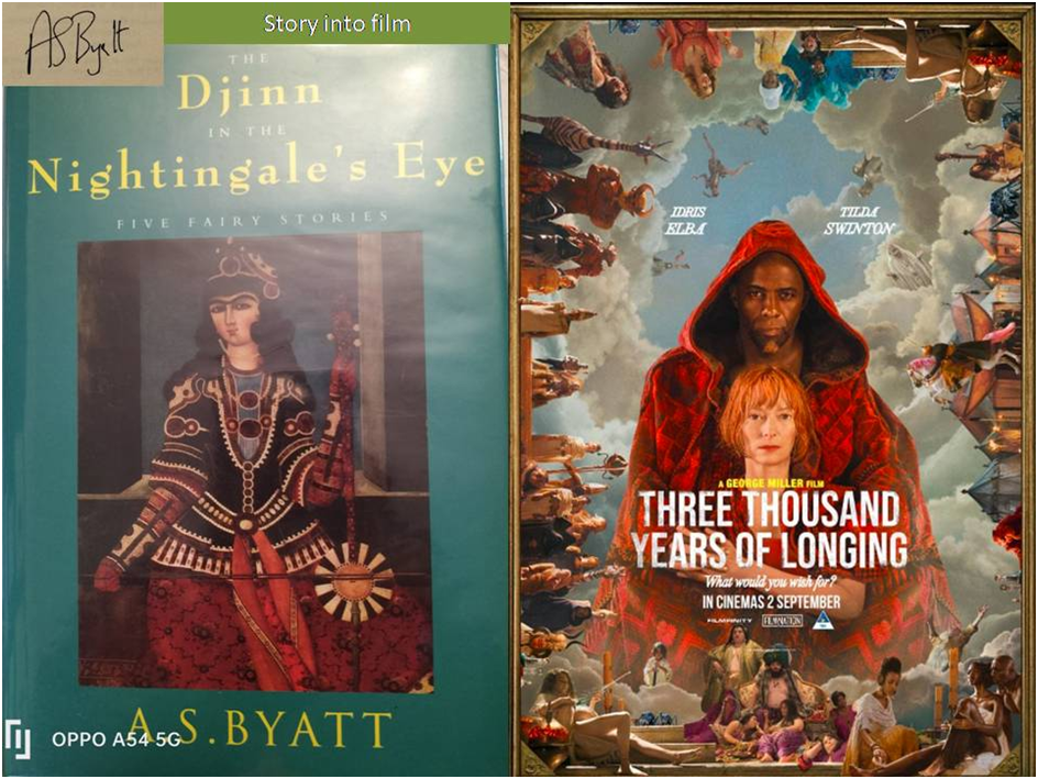 ‘She had written a secret book, … a book about a young man called Julian who was in hiding, disguised as a girl called Julienne, in a similar place. … And how did the story progress, asked the Djinn,.., how did you resolve it? I could not, said Dr Perholt. It seemed silly, in writing, I could see it was silly. … the more realism I tried to insert into what was really a cry of desire – for nothing specific – the more silly my story.’[1] This blog is about Three Thousand Years of Longing, the 2022 film directed by George Miller, starring Tilda Swinton and Idris Elba. Miller wrote the screenplay with Augusta Gore, a 1994 short story. It also uses the text of that story by A.S. Byatt, “The Djinn in the Nightingale’s Eye” in A. S. Byatt (1994) “The Djinn in the Nightingale’s Eye: Five Fairy Stories”, London, Chatto & Windus.