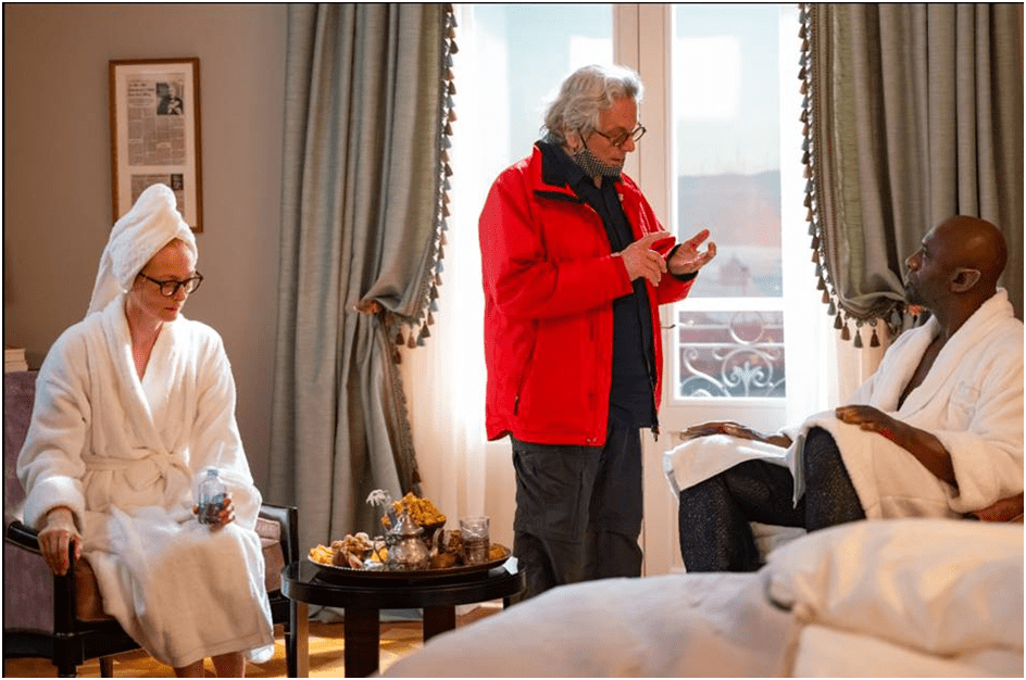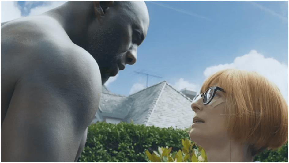 Thus speaks, I think, someone with little grasp of the marriage of the English class system with educational opportunity and job-role opportunities or English xenophobia, though the latter is undeniably dealt with in a comic manner. That too is an Enlists trait I believe. Peter Bradshaw, in The Guardian, who does understand the oddness of English social life still finds the film a ‘garrulous yet almost static movie’ with ‘no single important storyline’.[16] Christina Newland in The i also sees a mix of ‘open-hearted fantasy’ together with the ‘perceived silliness of the story’ that ‘will not be for everyone’.[17] In my opinion, these views fail to comprehend that this work is not about narrative just because it is about a narratologist, and that it rather takes on board the same interest as Byatt has in what we could almost call philosophical dialogue, where stories play the role of analogies for states of being, as in Plato’s philosophical work perhaps, if rather more entertaining and telling more modern jokes. Indeed Miller goes somewhat further in that direction. Where Byatt has the bemused djinn lift from the television in Gillian’s Turkish hotel bedroom an homunculus representing Boris Becker (then merely a tennis player), Idris Elba’s djinn to Alithea’s shock (as played by Tilda Swinton) lifts out a homunculus of Albert Einstein. The play with ‘the swell and contraction of physical forms’ as Anthony Lane says, may have less to do with the play on the power, gender and the sexual in Byatt, as I have tried to show above, than with Miller’s interest in relativity as a necessity of filmic visual representation. As Lane also says: