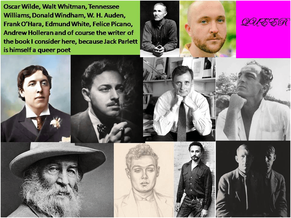 The case of Fire Island may suggest already a panoply of queer lifelines well woven into the life of the place for much of its history, even if for only a portion of its geography. However, artists are also well represented in this history – if mainly literary artists. Fire Island’s history touches on the history of queer figures and icons such as Oscar Wilde, Walt Whitman, Tennessee Williams, Donald Windham, W. H. Auden, Frank O’Hara, Edmund White, Felice Picano, Andrew Holleran and of course the writer of the book I consider here, because Jack Parlett is himself a queer poet as well as literary historian and critic.