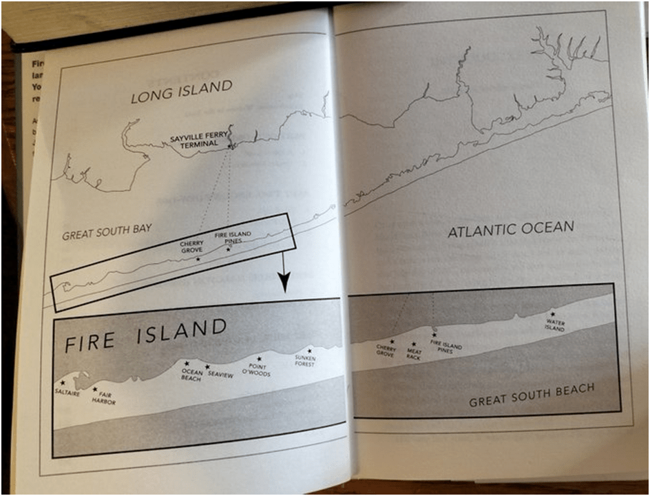 And the time in which a place lives is also, like that of a person, one with a physical framework or skeleton and various modes of self-realisation as ideas, emotions and their externalisation as that which clothes the physical, to use Carlyle’s metaphor from Sartor Resartus. These modes metamorphose through time, their themes played out in the diverse micro-biographies that recur through the book. The living physical framework of the Fire Island persona is the skeletal protrusion that is the island, conceived as a living person itself. Hence topographical elements matter: A colourful map might help us here.