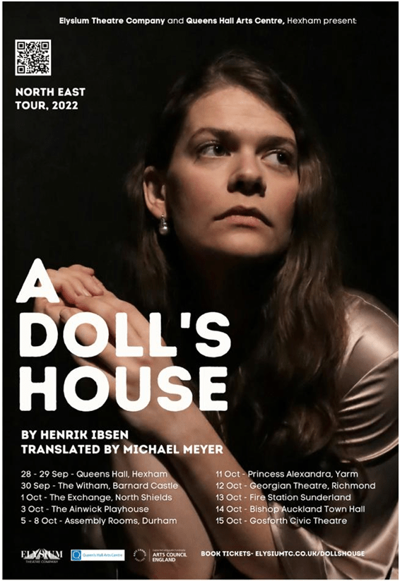 ‘The biggest task of the show is the actress playing Nora’s (sic.). … A more selfish actress would make the whole play about herself, but not Hannah [Ellis Ryan]. For her it’s very much an ensemble. Michael Meyer, the translator, always used to say that actors who want to grandstand, who aren’t willing to play relationships, always fail with Ibsen, because what fascinated him was the complexity of relationships’. [1] This blog discusses the production of Henrik Ibsen’s A Doll’s House (Michael Meyer translation) by Elysium Theatre Company played on 14th October at Bishop Auckland Town Hall. References to text (not in all precise respects like the production adapted one) from Henrik Ibsen (translated Michael Meyer) [1990: 23 – 104] Plays: Two (A Doll’s House, An Enemy of the People, Hedda Gabler) published in London by Methuen Drama.