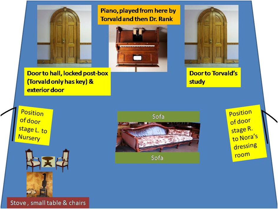Invaded by Krogstad’s needs to restore his own adult respectability by using evidence of her past behaviour (she forged her dying father’s signature as guarantor on an I.O.U. proffered to Krogstadt for a loan), she sends the children into the nursery stage left to ‘play’. Nora’s soliloquised examination of her own mixed motives for her past action and thoughts of its possible consequences are interrupted by the children now standing at the supposed nursery doorway at stage left.