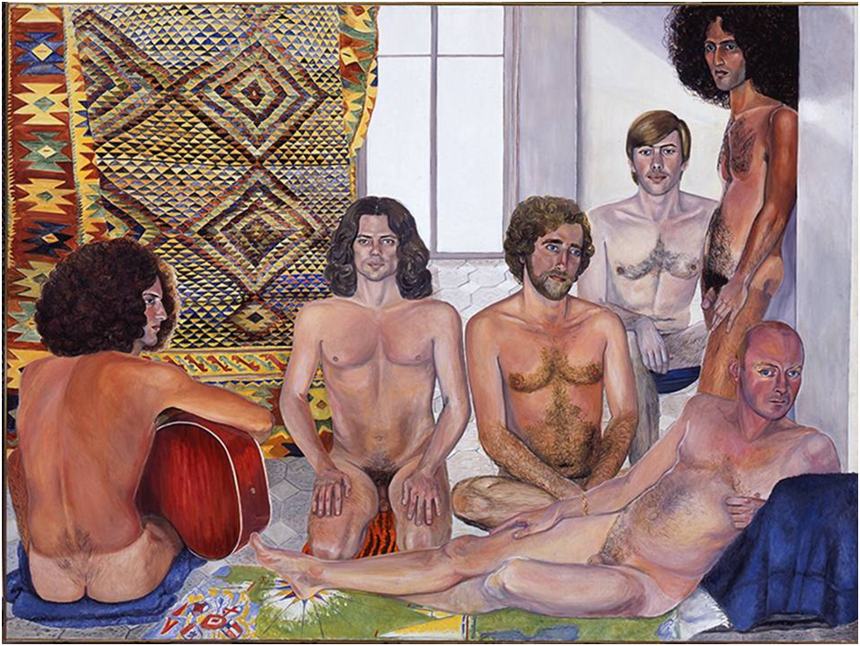 In some cases the object of an artist may be not to challenge aesthetic norms applied to art but social ones. We can see that such art dates more quickly and can fade into a merely decorative comment on the long history that seemed to favour female nudes only as the objects of male gaze. Silvia Sleigh, according to Borzello ‘reworked Jean-Auguste-Dominique Ingres’s The Turkish Bath of 1863 to produce her startling line-up of relaxed masculinity’.[9] The received wisdom about this lovely painting is that it uses real men to explore masculine naked beauty (including her own husband on the bottom right), although the main effect is to shock by the revelation of how nineteenth-century Orientalism sexualised a false notion of femininity as a plentiful luxury to be possessed by men, visually at least. Orientalism is born at the moment in history when women in the West were beginning to show their lives were neither idle nor securely supported by men who care for them, indeed rather the reverse is the truth. These men are not ‘startling’ as ‘nudes’ as such but in the proximity that they bear to each other, about which their quizzical look out to the viewer of either sex seems embarrassed and nervous. I don’t see ‘relaxation’ here as Borzello does except as a pose enacted as per direction by the artist.